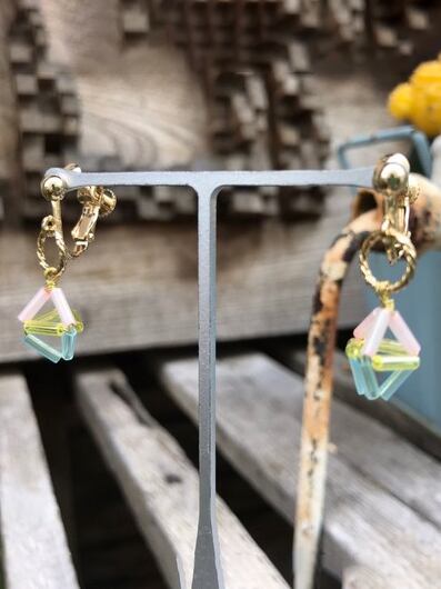 ガラスビーズの色は、乳白色ピンク・透明イエロー・透明水色です。 約0.6cmのツイストガラスビーズで製作した、約1.0cm×1.5cmの、縦菱形。 写真は、ネジバネ式イヤリング使用です。 ピアス ⇄ イヤリング交換出来ます。 「パーツの変更」からお選び下さい。