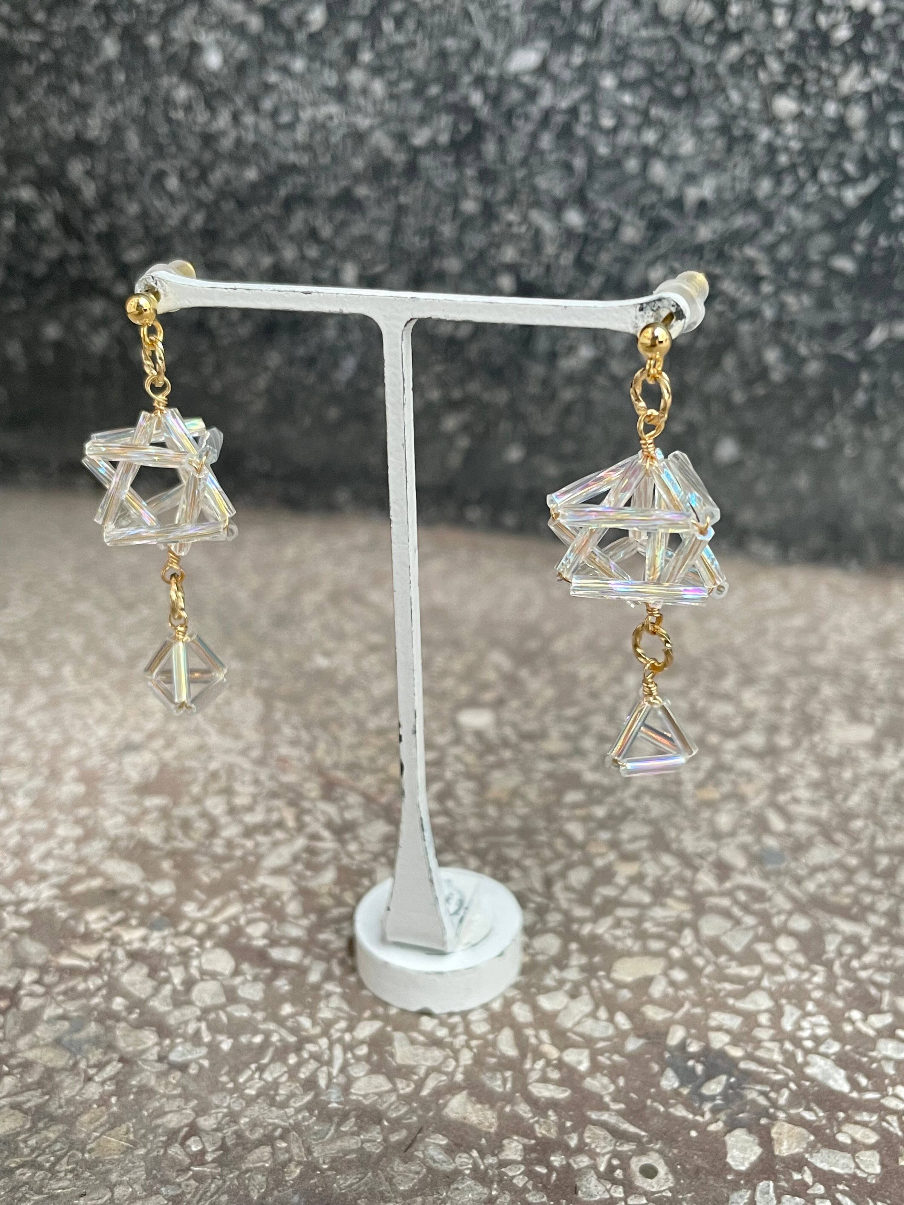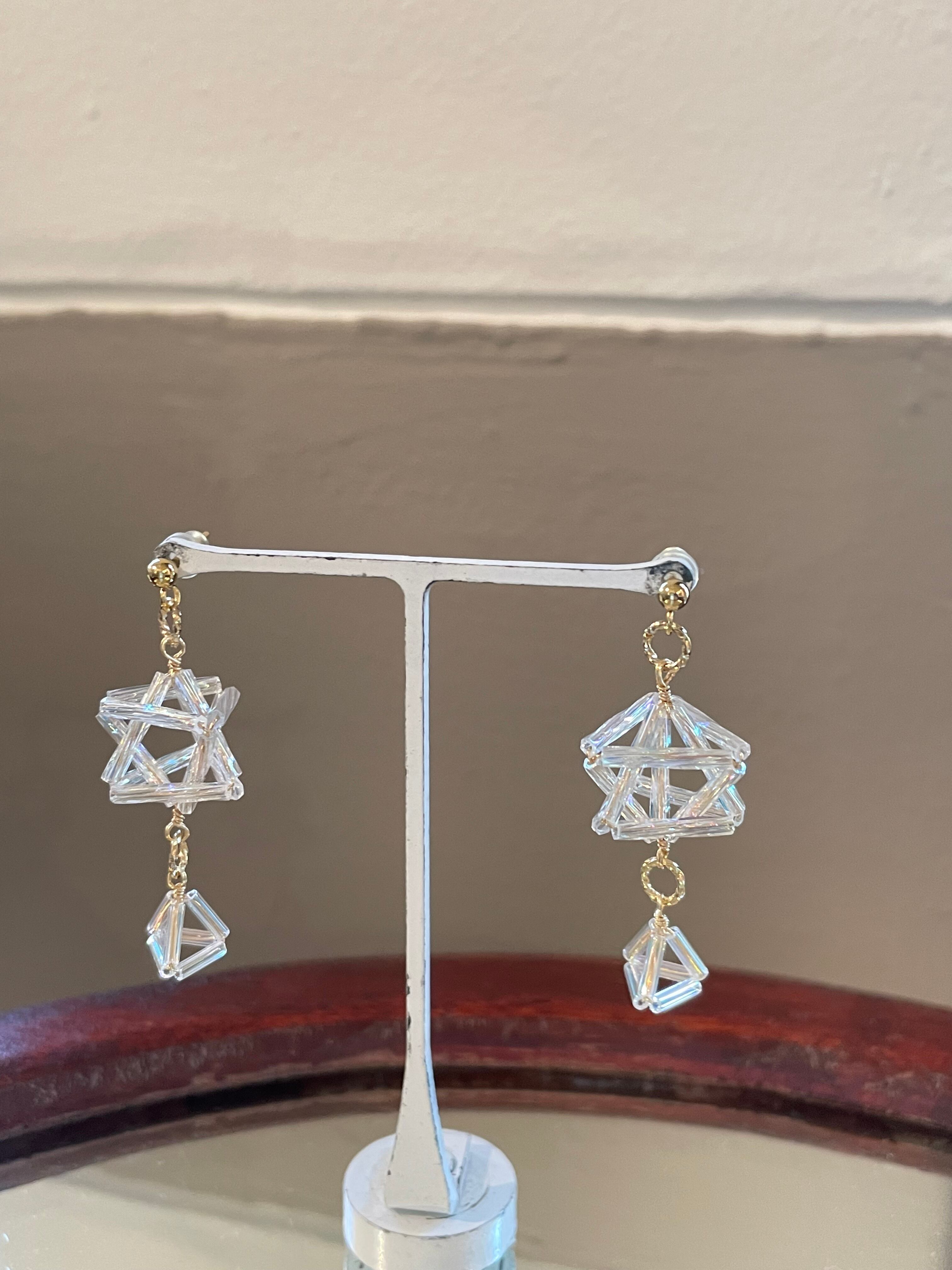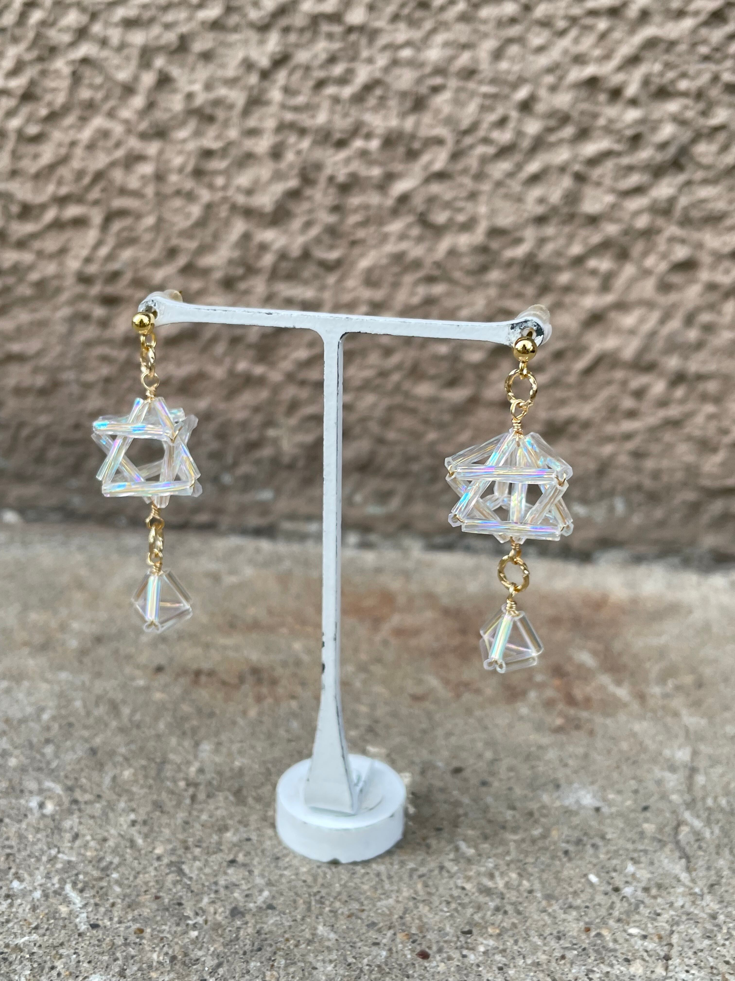 ガラスのビーズを使って、製作しています。 上段の六芒星イメージは、約1.2cmのツイストのクリアオーロラで製作しています。 下の三角は、約0.6cmのストレースのクリアオーロラのガラスで製作してます。 写真は、サージカルステンレスピアス スティックタイプです。 ピアス⇄イヤリング交換出来ます。 「パーツの変更」からお選び下さい。