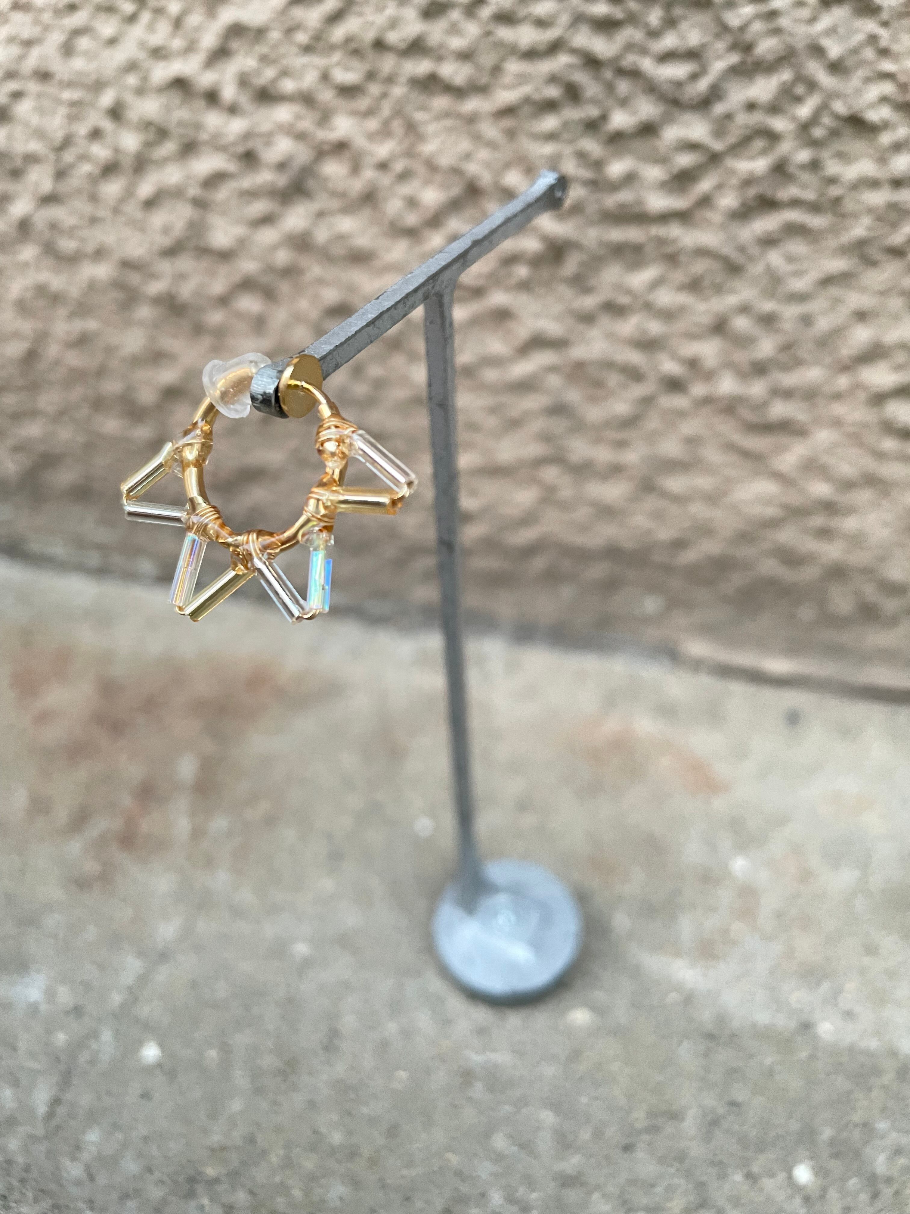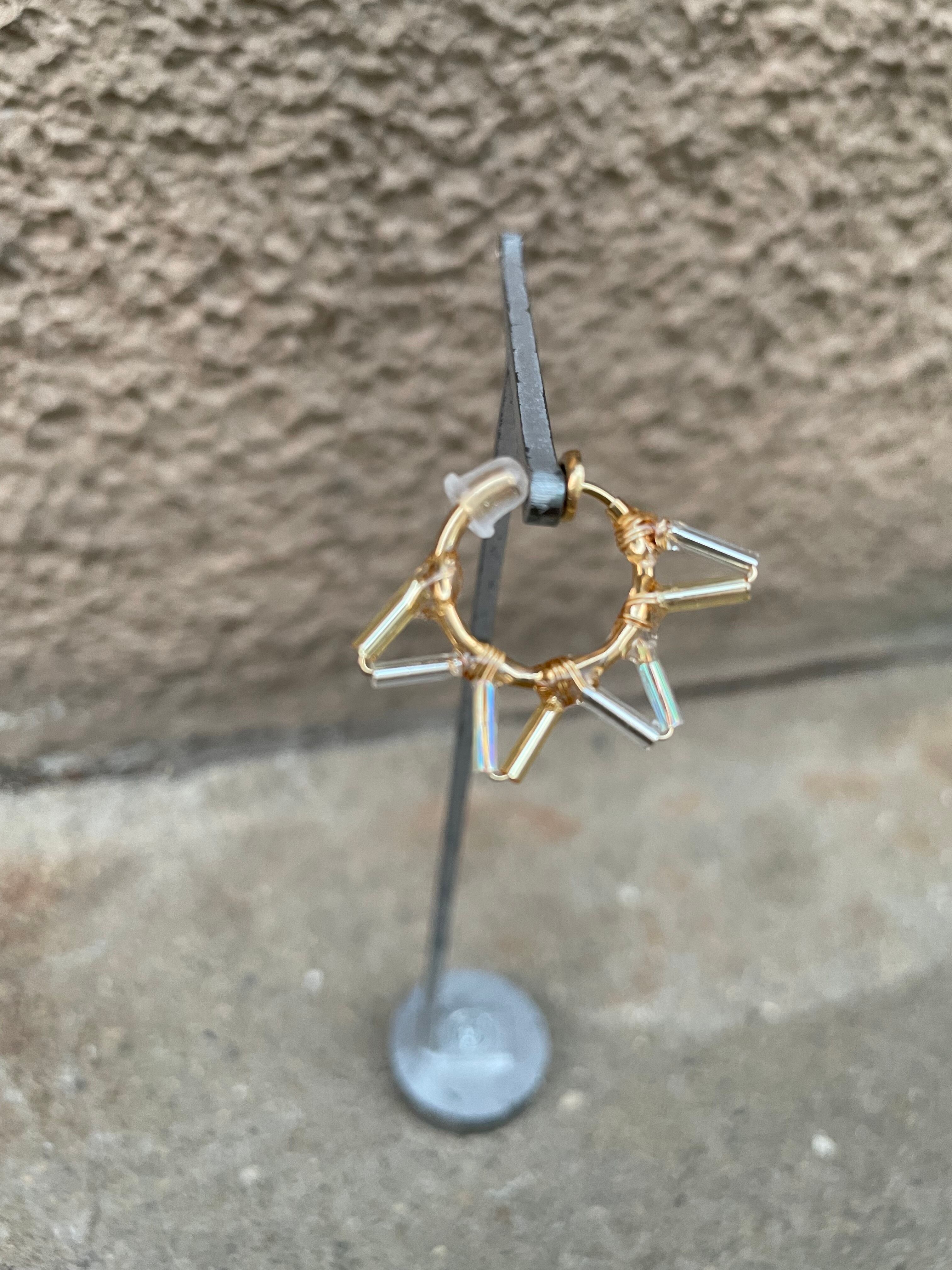 ストレートの約6mmゴールド・シルバー・クリアオーロラ3色のガラスビーズを、4山作って製作してます。